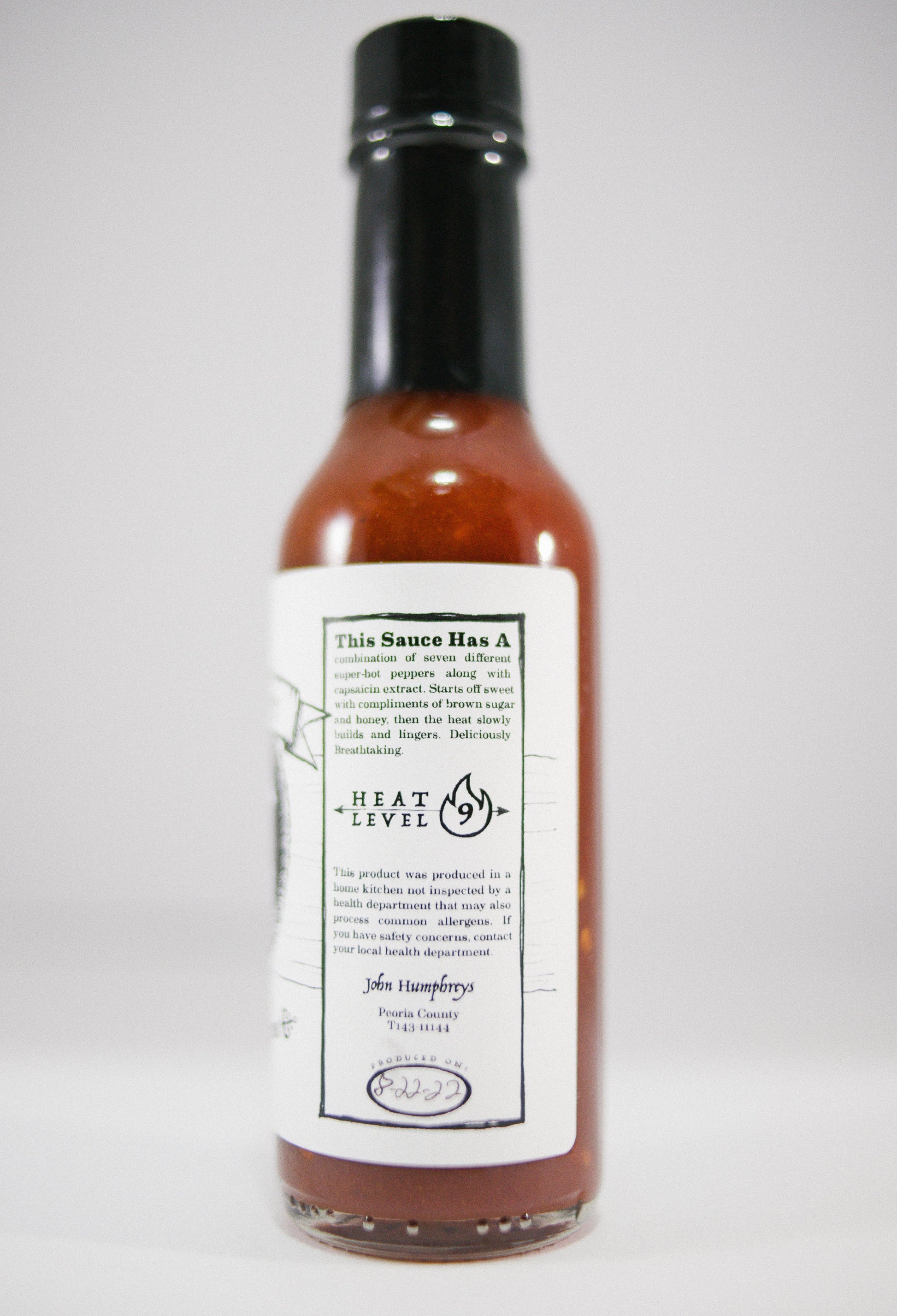 This sauce has a combination of seven different super-hot peppers along with capsaicin extract. Starts off sweet with compliments of brown sugar and honey, then the heat slowly builds and lingers. Deliciously breathtaking.